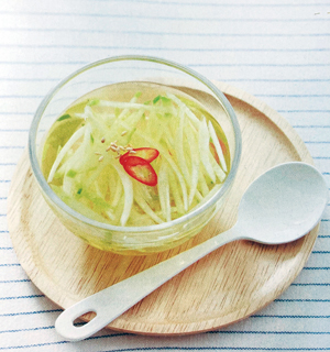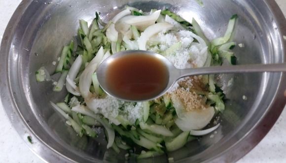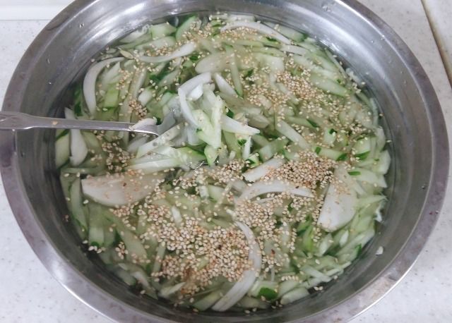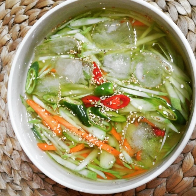 오이냉국 황금레시피 초간단 방법 알아보기 오이냉국 황금레시피 또 하나 팁을 드리면 이때 양념물을 한 번 끓이는 경우도 있는데요, 끓인물을 동원하면 소금, 설탕 등도 잘 녹고 식초의 강한 맛을 잡아 준다고합니다. 간마늘 한 숟갈, 설탕 한 숟갈 반, 액젓 두 숟갈을 넣어 준답니다.