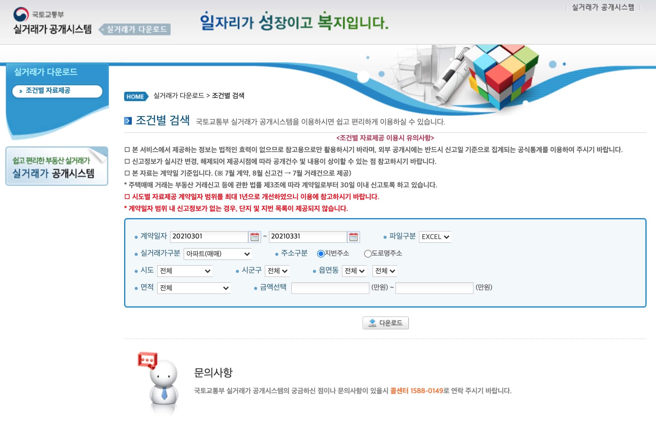 국토해양부 아파트실거래가조회 방법 다만, 계약일의 기간이 365일을 넘는 기간은 조회는 할 수 없지만, 특정 지역에 대개 거래 이력을 한 번에 볼 수 있습니다. 아파트 실거래가 조회 밖에도 단독/다가구, 오피스텔, 토지, 연립/다세대, 공장/창고 등 여러 가지 주택에 대하여서도 조회가 가능하더라고요. 상단에 메뉴를 눌러 조회가 가능하더라고요만, 단독/다구간이나 토지의 경우, 읍면동 단위로 조회가 가능하기 때문에, 보다 넓게 봐주세요.