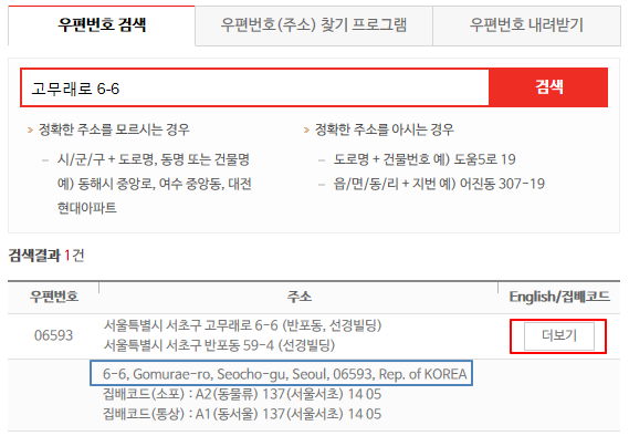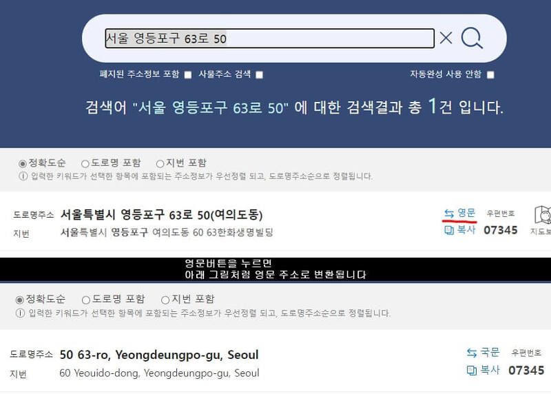 조회 포털 사이트에서 영문주소 변환을 조사해서 둘러보겠습니다. 변환하고자하는 주소를 도로명 그렇지 아니하면 지번 주소로 입력하면, 혼자 스스로 영문주소로 변환이 돼요. 우편번호까지 나와있어서 역시 간결해요.