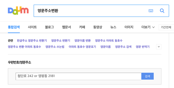영문으로 주소를 변환하는 것은 인터넷만 연결되어 있으면하는 포털사이트를 사용해서 조회 시 바로 나타나지만 아파트와 빌라, 상가 등의 상세 동호수 까지는 나타나지 않다고해요.