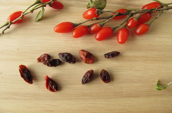 건립된 구기자는 열매의 한 쪽이 뾰족한 방추상이고, 열매껍질은 적색 또는 어두운 적색이라고요. 바깥면은 쭈글쭈글하고 열매 속에는 황색 혹은 흰색의 납작한 타원형 형상의 씨가 들어있고요.