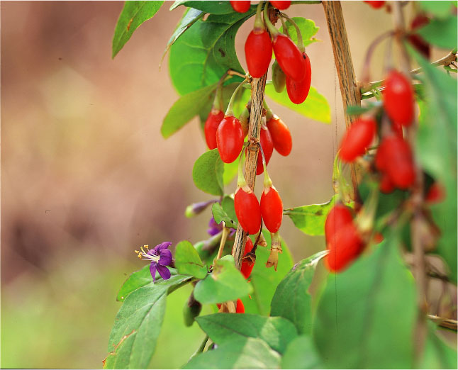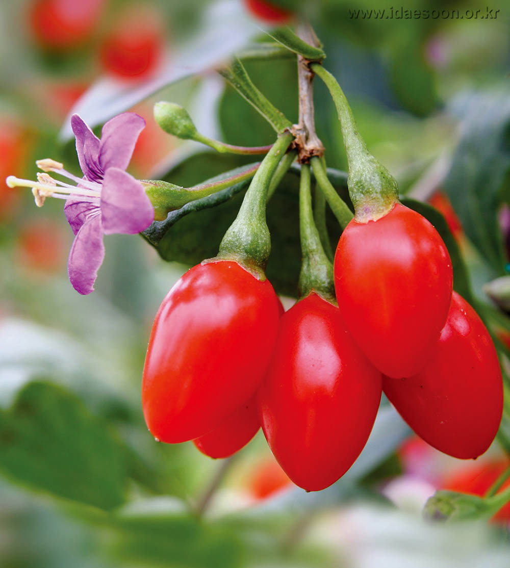 여름에 자색 꽃이 피고 열매는 가을에 붉게 변 해요. 구기자는 오래 받아들이면 뼈가 튼튼해지고 몸이 가벼워지면서 흰머리가 검게된다고 고명해져 있으며, 눈이 밝아지고 추위와 더위를 타지 않게 된다고 많이 알려져 있고요.